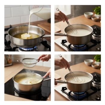 Tiếp đó rây vào nồi 30g bột mì, chỉnh lửa nhỏ, dùng phới đảo nhẹ nhàng 3 – 4 phút cho tới khi bột sánh lại thì tắt bếp.